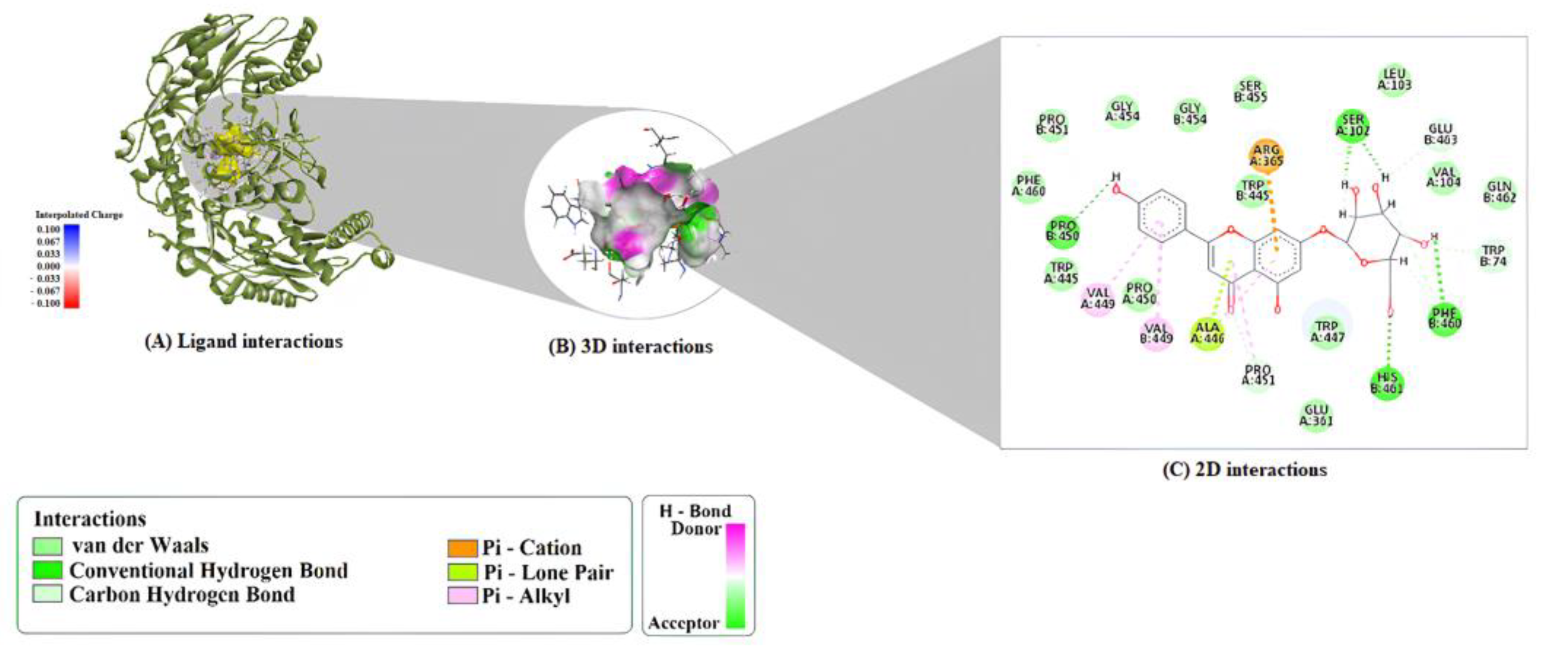 For the 9ED1 protein, A7G’s binding was mediated by hydrogen bonds with HIS461, PHE460, SER102, and TRP74, among others. This orientation was stabilized by a π–cation interaction with ARG365 and a π–lone pair interaction with ALA446. The complex was further anchored by hydrophobic contacts with ALA446, PRO451, and VAL449 (Figure 3).