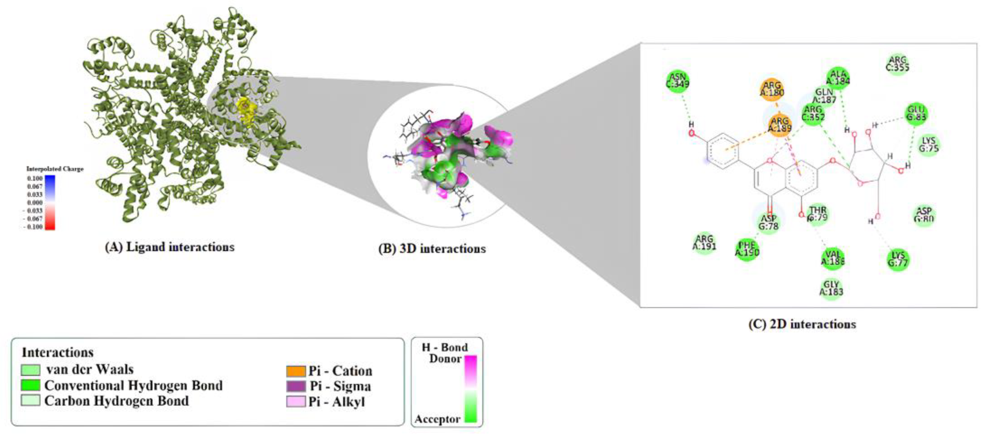Table 2 delineates the specific molecular interactions that stabilize the binding of compound A7G to the selected protein targets. Within the active site of 1M9M, A7G established a robust network of hydrogen bonds with key residues, including ARG352, ARG189, PHE190, ARG191, LYS75, ALA184, and ASP78. The binding pose was further reinforced by π–cation (with ARG180) and π–anion (with ASP78) interactions, complemented by several hydrophobic contacts involving residues ARG189, ALA184, and LYS75 (Figure 1).