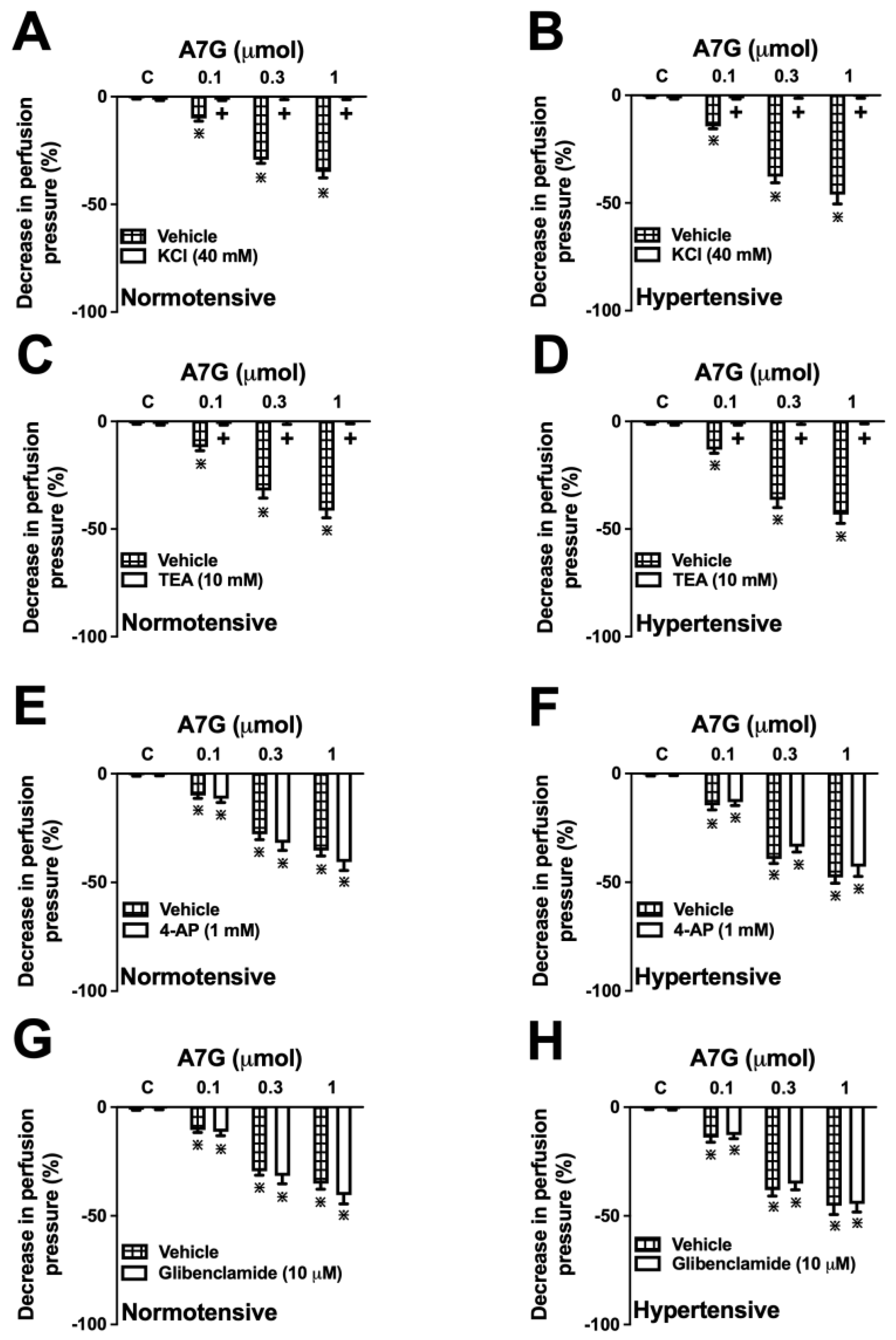 Involvement of K+ channels in the A7G-induced vasorelaxant response in the mesenteric vascular beds of Wistar Kyoto (normotensive) and spontaneously hypertensive rats (hypertensive). The panels illustrate the vasorelaxant effect of A7G in a high K+ medium (40 mM KCl; (A,B)), or in the presence of the non-specific K+ channel inhibitor tetraethylammonium (TEA, 10 mM; (C,D)), the KV channel inhibitor 4-aminopyridine (4-AP, 100 µM; (E,F)), or the KATP channel inhibitor glibenclamide (10 µM; (G,H)). All data are expressed as the mean ± S.E.M. from 6 preparations per group. + p < 0.05 denotes a significant difference from the vehicle group; * p < 0.05 denotes a significant difference from the previous dose.