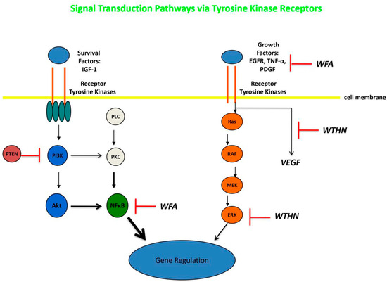 Diagram of signal transduction pathways, with WFA inhibiting NF-κB, EGFR, and TNF-α and WTHN inhibiting VEGF and ERK. Based on references [23,24,25,33,34,35,36,37]. WFA—withaferin-A; WTHN—withanone. Author’s own work.
