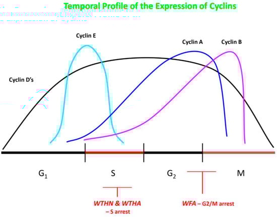 Diagram of WFA inhibiting the cell cycle at the G2/M phase, while WTHN and WTHA are inhibiting the cell cycle in the S phase. Based on references [23,24,25,33,34,35,36,37]. WFA—withaferin-A; WTHN—withanone; WTHA—withanolide-A. Author’s own work.