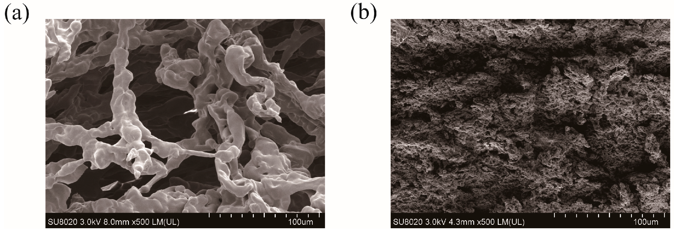 SEM images are taken to record the morphological changes between PHMAA and the precipitates. PHMAA showed a loose fiber-like morphology with a lot of pores (Figure 7a) [41], and, after chelating with metal ions, the structure changed significantly. The precipitates presented a tight structure (Figure 7b), and the loose pores disappeared. The morphological change revealed that chelation occurred between PHMAA and metal ions. During this procedure, metal ions performed as the “bridge” to connect the PHMAA chains, resulting in a sharply increased molar weight and decreased solubility; hence, the precipitates were formed.