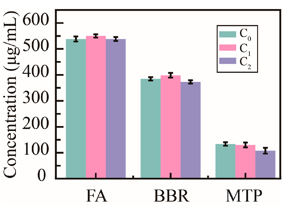 To verify the influence of PHMAA on the active ingredients in decoctions, the concentrations of ferulic acid (FA), berberine (BBR), and monotropein (MTP) were determined (Figure 8). The original concentration (C0) of FA in the Ligusticum wallichii decoction was 538.0 ± 9.6 μg/mL; the concentration (C1) was 545.1 ± 6.5 μg/mL after adding Cd2+ ions; the final concentration (C2) was 538.3 ± 7.5 μg/mL after adding PHMAA and filtrating the precipitates. The initial concentration (C0) of BBR in the Coptidis rhizome decoction was 384.7 ± 6.5 μg/mL; the concentration (C1) was 398.5 ± 9.0 μg/mL after adding Cd2+ ions; the final concentration (C2) was 373.1 ± 6.6 μg/mL after adding PHMAA and filtrating the precipitates. Moreover, the initial concentration (C0) of MTP in the Morindae officinalis radix decoction was 133.5 ± 6.6 μg/mL; the concentration (C1) was 129.9 ± 9.5 μg/mL after adding Cd2+ ions; the final concentration (C2) was 107.7 ± 11.2 μg/mL after adding PHMAA and filtrating the precipitates. No significant change was shown during the whole removal procedure. This research implied that PHMAA would not affect the activity of decoctions.
