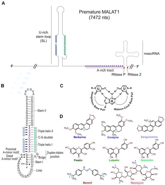 Technological advancements have established the importance of long noncoding RNAs (lncRNAs) in various biological functions, and their dysregulation is associated with various diseases, including cancer [,]. One lncRNA that promotes metastasis of various cancer types is metastasis-associated lung adenocarcinoma transcript 1 (MALAT1); therefore, MALAT1 has emerged as a drug target, most notably its 3′ end [,,,,]. At its 3′ end, MALAT1 contains a U-rich stem loop (SL), a genomically encoded A-rich tract (A), and a tRNA-like structure called MALAT1-associated small cytoplasmic RNA (mascRNA) (Figure 1A) [,,,]. pre-mascRNA is excised by RNases P and Z, generating a mature form of MALAT1 that forms a blunt-ended triple helix (SL+A) involving the U-rich SL and A-rich tract (Figure 1A,B) [,,]. This predominantly U•A-U-rich triple helix (whereby Hoogsteen and Watson-Crick interactions are represented by a dot (•) and solid line (-), respectively) protects MALAT1 from degradation (Figure 1B,C) [,,]. The MALAT1 triple helix has one confirmed protein-binding partner: the N6-methyladenosine writer protein methyltransferase-like protein 16 (METTL16) [,]. In addition to protein binding, several exogenous small molecules, which we henceforth refer to as triplex-binding molecules (TBMs), bind to the MALAT1 triple helix: diphenylfuran (DPF) derivatives [,], imidazole derivatives [], berenil and its derivatives [], 1,2,3-triazole derivatives [], and conjugated and aromatic heterocyclic compounds [,,,]. Although these studies have focused on the mature MALAT1 triple helix, it may be more therapeutically advantageous if a small molecule interfered with the formation of the triple helix by targeting a premature state such as the U-rich SL that likely forms co-transcriptionally or the premature 3′ end consisting of the SL+A+masc (Figure 1A). Like the mature MALAT1 triple helix, several aromatic/heteroaromatic small molecules have targeted a predicted triple helix at the 3′ end of the multiple endocrine neoplasia-β (MENβ) lncRNA: aurintricarboxylic acid, mitoxantrone emodin, GW5074, mitoxantrone, and rottlerin []. These TBMs have been explored primarily for therapeutic purposes, although we still do not have a solid understanding of the basic chemical and physical properties that TBMs leverage to preferentially bind to triple-helical RNA structures.
