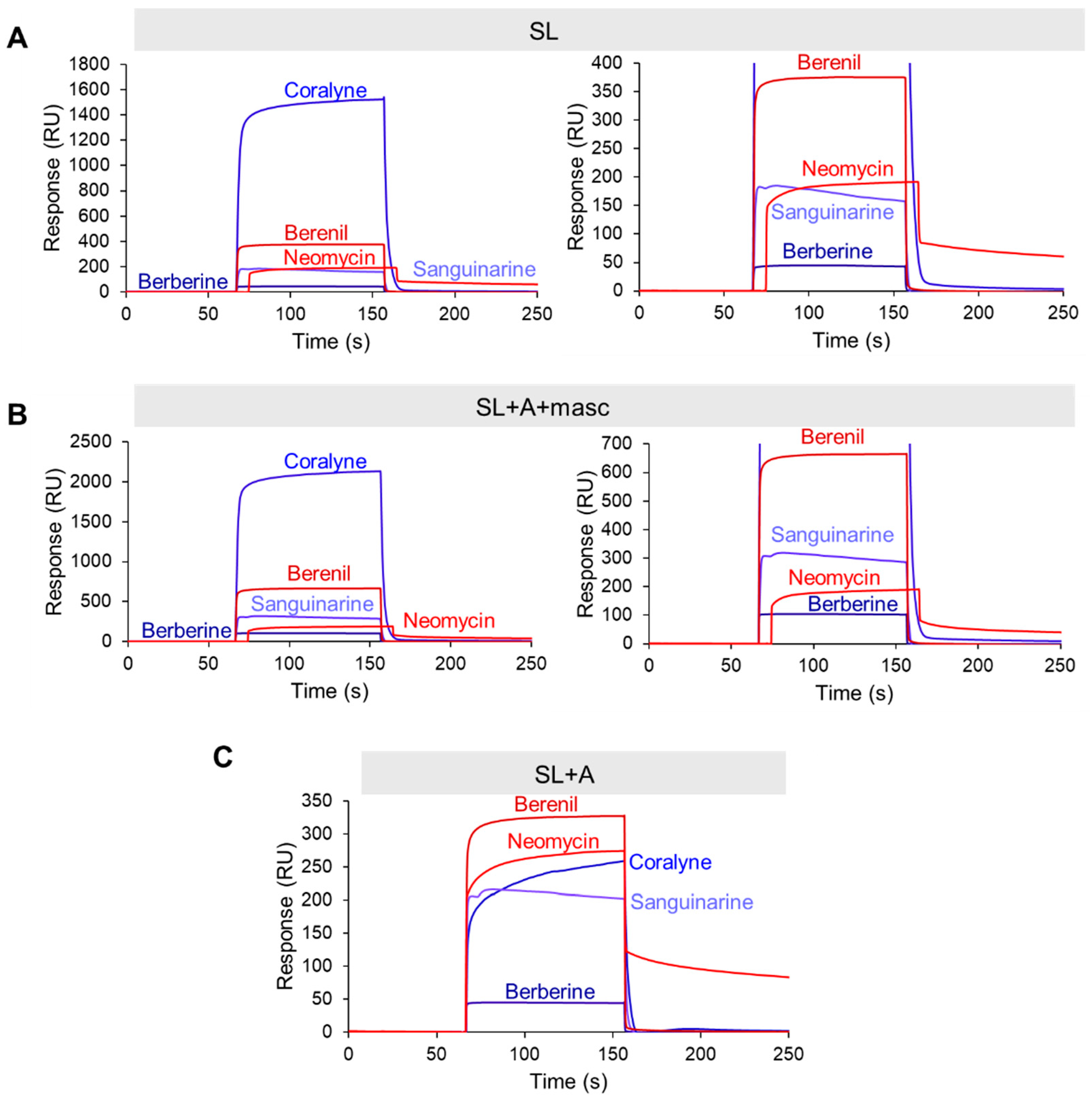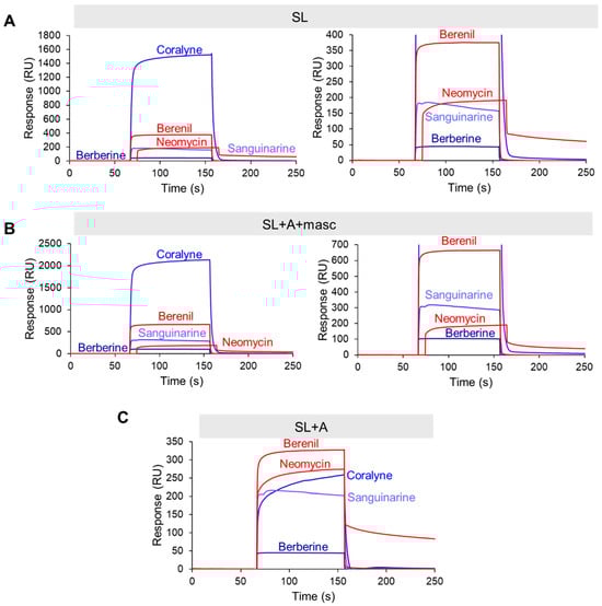 RNase P efficiently processes the 3′ end of MALAT1; therefore, any TBM targeting the precursor states would need to occur rapidly []. We employed surface plasmon resonance (SPR) to evaluate the relative binding trends of the TBMs engaging with the MALAT1 SL, SL+A+masc, and SL+A. We did not evaluate mascRNA, as the TBMs did not reveal a major impact on thermal stability (i.e., ∆TM < 3.2 °C, Table S8). To perform this experiment, we first modified each RNA by extending the 5′ end with a 24-nucleotide sequence that is complementary to a 3′-biotinylated DNA oligonucleotide (Table S6). This biotinylated DNA-RNA hybrid was immobilized onto the streptavidin-coated SPR sensor chip, followed by the injection of TBMs (0, 1, 10, and 100 µM) (Figure S8). Binding trends were inferred at 100 µM TBM concentration to ensure steady-state and saturation of the RNA. Our UV melting results revealed that the flavonoids did not alter the thermal stability of MALAT1 SL+A (Figure 2C) and SL+A+masc (Figure 4H); therefore, we did not examine these TBMs. We analyzed the SPR sensograms to qualitatively examine the relative association and dissociation slopes for MALAT1 SL, SL+A+masc, and SL+A (Figure 5A–C and Figure S9). Changes in the slope of the association phase were used to rank the TBMs on binding speed. Quick binding interactions were defined as steep slopes lacking curvature, while slow binding was gradual slopes with rounded curvature. Based on these criteria, the relative rankings from fastest to slowest are the same for all three RNAs: berberine = sanguinarine > berenil > coralyne > neomycin (Figure 5A–C and Figure S9). Coralyne displays an unusually large response, which may indicate self-association []. Dissociation slopes were relatively steep and similar for all TBMs, although neomycin did not fully dissociate after 100 s (Figure S9E). These results show that the five TBMs interact transiently with the three different RNAs, suggesting that it is possible for the TBMs to dual target the premature and mature forms of the MALAT1 triple helix.