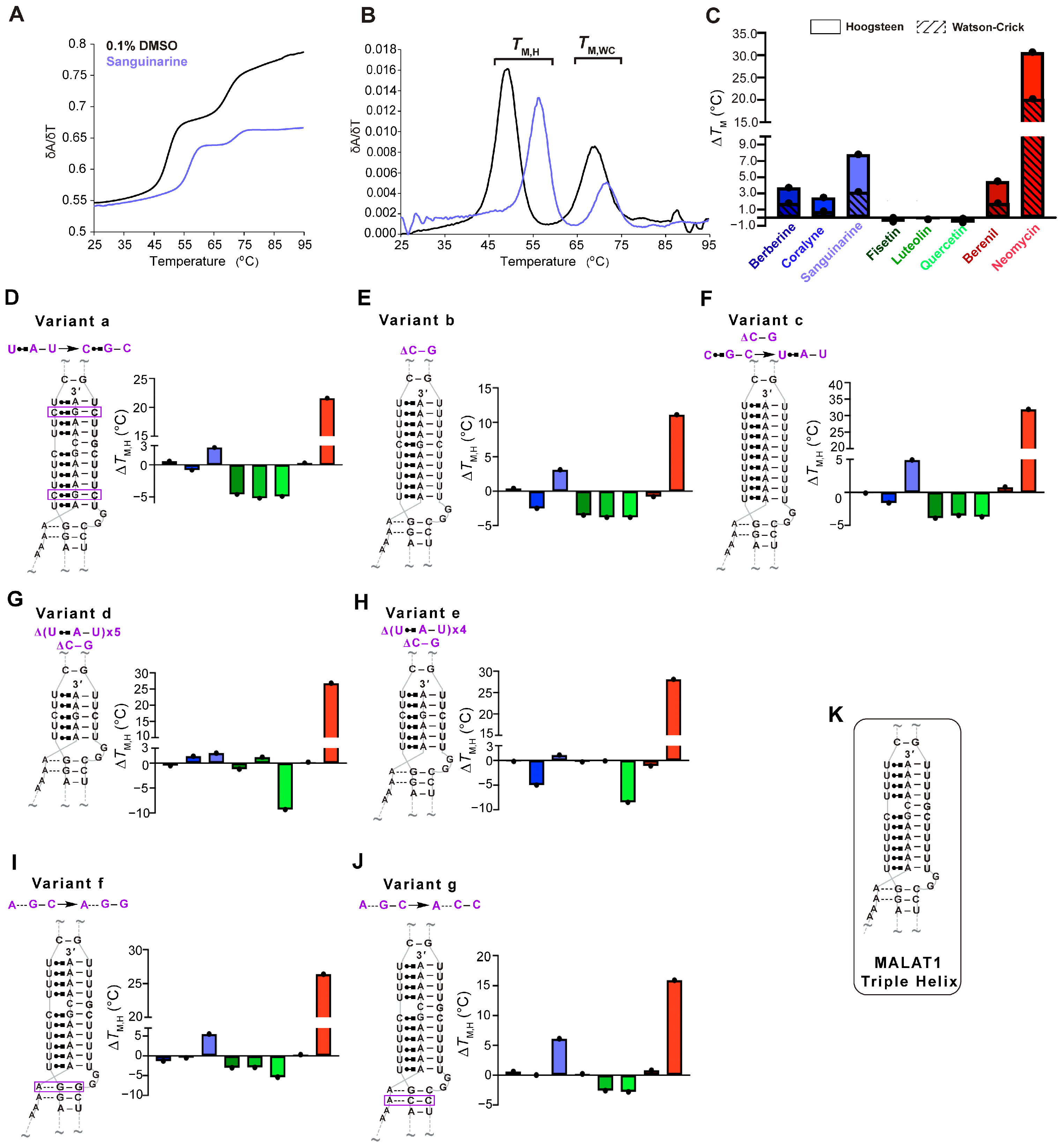 UV thermal denaturation results for the WT MALAT1 triple helix and MALAT1 variant RNAs in the absence and presence of TBMs. Plots of normalized (A) UV absorbance and (B) first derivative with respect to temperature for the MALAT1 triple helix in the absence (black line) and presence of sanguinarine (light blue). Bar plots show changes in the Hoogsteen (solid color) and the Watson-Crick (striped) melting temperatures for TBMs binding to (C) WT MALAT1, (D–F) variants with changes in nucleotide composition variants a–c, (G,H) shorter triple helices variants d and e, and (I,J) disrupted A-minor interactions are variants f and g. Bar colors correspond to the TBM as defined in Figure legend 1C. All bar plots are the average ∆TM (n = 3), denoted by a single black dot. (K) A schematic is shown for the WT MALAT1 triple helix, focusing on the major-groove triple helix and A-minor motif. A tilde (~) denotes that peripheral RNA regions were present in the experiment but are not shown in the schematics for brevity. The Hoogsteen and Watson-Crick interactions are represented by Leontis-Westhof notation (