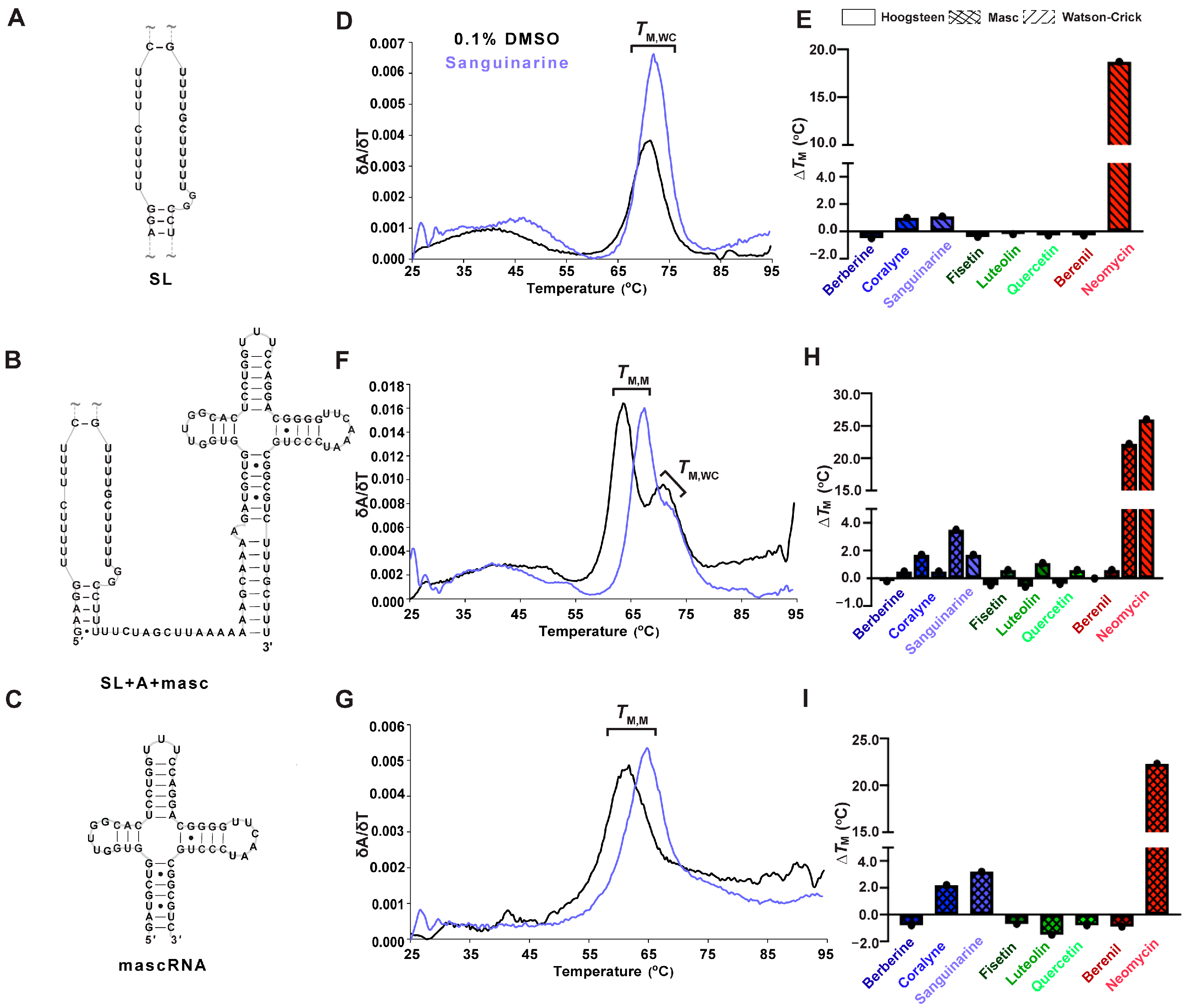 Because RNA folding occurs co-transcriptionally and the 3′ end of MALAT1 likely undergoes processing prior to formation of the mature MALAT1 triple helix (SL+A) [,,], we were interested in determining whether TBMs could also target the premature MALAT1 RNAs (i.e., MALAT1 SL and MALAT1 SL+A-rich tract+mascRNA (SL+A+masc)) as well as mascRNA to monitor effects due to that unique structure [] (Figure 4A–C, Table S6). The SL, which cannot form a triple helix but still contains structural motifs such as single mismatches and bulged loops like SL+A, exhibits a single-peak melting profile, i.e., only the TM,WC peak at 71.2 ± 0.3 °C (Figure 4A,D, Table S7). In general, the ∆TM,WC values were similar for both SL and SL+A in the presence of TBMs, except berberine, sanguinarine, and berenil exhibited about a 2 °C destabilization relative to SL+A (Table 1 and Table S8). This result suggests that the TBMs bind to a major-groove triple helix as opposed to an RNA lacking base triples (Figure 2C and Figure 4E, Tables S7 and S8).