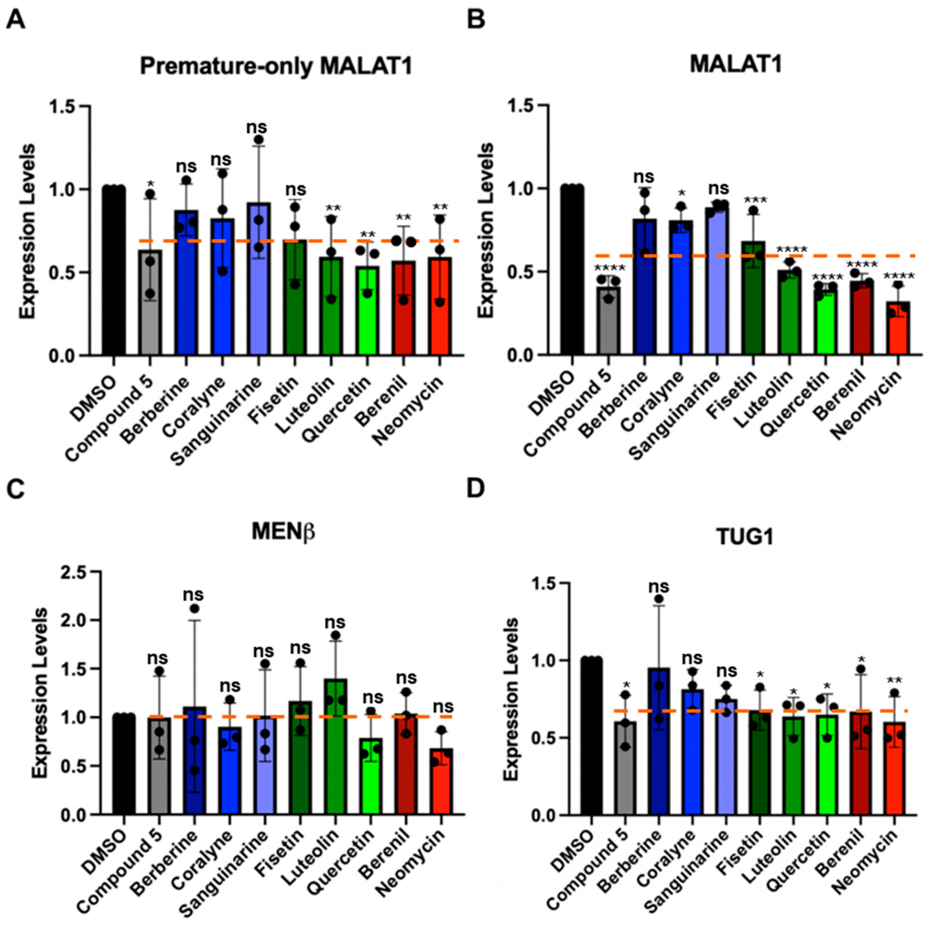 Effect of TBMs on the expression levels of various RNAs in HCT116 cells. RT-qPCR results show changes in expression for (A) premature-only MALAT1, (B) premature and mature MALAT1, (C) MENβ, and (D) TUG1 (unspliced Intron 1) when HCT116 cells were treated for 48 h with 1 μM of each TBM (berberine, coralyne, sanguinarine, fisetin, luteolin, quercetin, berenil, and neomycin) and with a previously studied TBM: compound 5 (Figure S5) []. The expression values were first normalized with respect to the geometric mean of four housekeepers: 18s rRNA, beta-actin (β-actin), glyceraldehyde-3-phosphate dehydrogenase (GAPDH), and U6 snRNA. The resulting values were then normalized with respect to the DMSO-treated sample set at an arbitrary value of 1 []. Results are averages ± standard deviation of biological triplicates (n = 3). p-values were calculated from the average 2−∆∆CT using a two-way ANOVA test, comparing each TBM to the DMSO control: **** p-value < 0.0001, *** p-value < 0.0002, ** p-value < 0.0021, * p-value < 0.0332, ns p-value < 0.1234. The software used for statistical analysis was GraphPad Prism 10 (RRID:SCR_002798). An orange dashed line indicates average expression change for each RNA target across all TBMs. Raw and processed RT-qPCR data, including PCR efficiencies (90.1–98.7%), are presented in File S4.