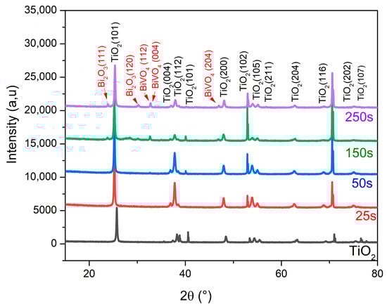 XRD patterns of BiVO4/TiO2 at different electrodeposition times (25, 50, 150, 250 s).