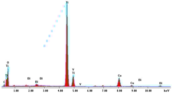 The performed EDX in Figure 7 confirms the high purity of the sample and the evidence of existing elements Ti, O, Bi, V.