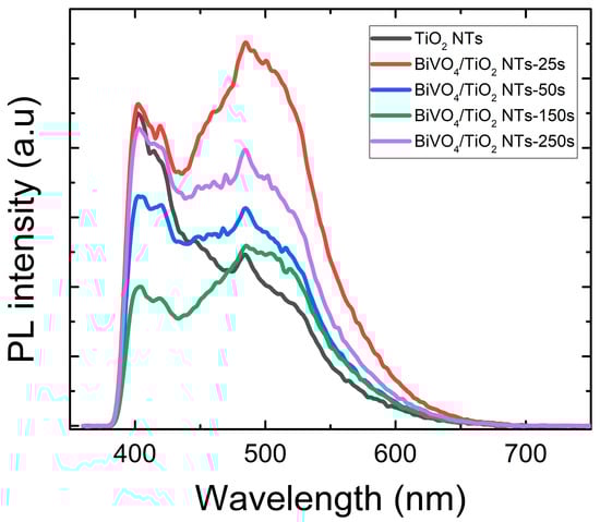 The migration, transfer and trapping of the photogenerated charge carrier’s electron–hole pairs in TiO2 were investigated with photoluminescence assessment, which also apprises the defects present in the band gap []. Figure 8 depicts the photoluminescence spectra of the BiVO4/TiO2 samples at different electrodeposition time 25 s, 50 s, 150 s and 250 s to better understand the impact of BiVO4 depositions on the optical properties of TiO2. Compared to the bare TiO2 nanotubes, it seems that all the samples present the same peaks located between 390 nm and 420 nm corresponding to 3~3.2 eV, which is compatible with the electronic transition between conduction and valence bands. The collection of peaks detected between 450 nm and 550 nm is related to the oxygen vacancies in TiO2 structure. Since the recombination of electron/hole is derived from the PL emission, the weaker the PL intensity, the lower the recombination rate.
