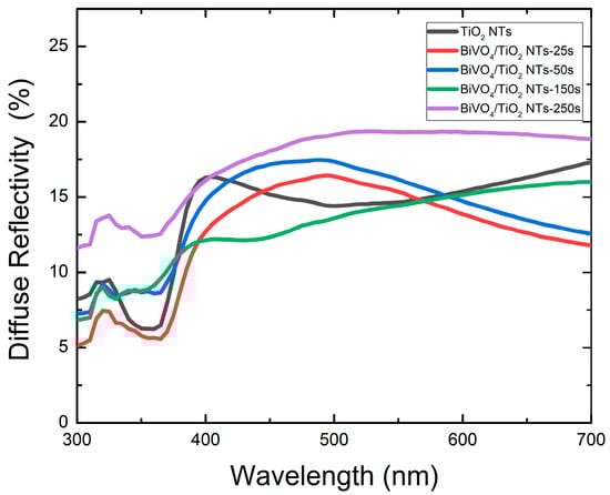The diffuse reflectivity spectra of as-fabricated samples have been investigated with UV–Vis spectroscopy as shown in Figure 9; the spectra depict a minimum for all samples up to 380 nm, which corresponds to the gap energy of anatase TiO2 3.2 eV; then, the diffuse reflectivity increases for higher wavelengths. It seems that 250 s electrodeposition time of BiVO4 nanoparticles presents the highest reflectivity, which could be due to the surface characteristics; however, on the contrary, the 25 s sample showed a lower reflectivity in comparison to pure TiO2 and other samples. To determine the band gap of each sample, the Kubelka–Munk formula was used to create the Tauc plots (F(R)hʋ)1/2 vs. hʋ [].