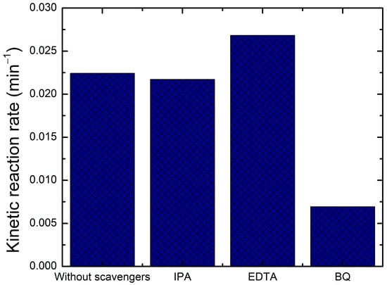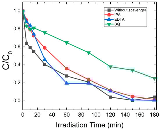 There are a variety of scavengers to use for the quenching of active oxygen species, including IPA, EDTA and BQ. These scavengers can trap holes (h+), hydroxyl radicals (OH•) and superoxide radicals (O2•−), respectively []. Figure 14 depicts the effect of scavengers on the degradation of AB under UV light for 180 min. The scavenger trapping test was conducted to better understand the photocatalytic mechanism and assess the effect of the responsible reactive molecules in the photocatalytic approach.