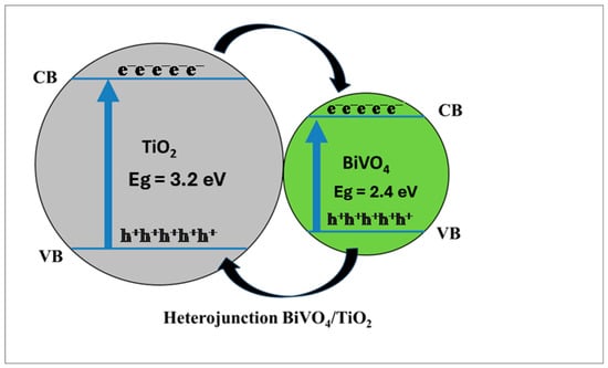 The same mechanism is performed on the surface of both photocatalysts, and after the production of these reactive species, ROS, they engage in the degradation of organic pollutants present in wastewater. The separation phenomenon of the photogenerated charge carries effectively reduces the recombination rate and enhances the photocatalytic efficiency of BiVO4/TiO2 nanocomposites; according to the literature, BiVO4 nanoparticles exhibit a work function of χ = 6.04 eV, while TiO2 possesses a χ = 5.8 eV [] after contact and the band alignment, as shown in Figure 16, is where the electrons transfer from the conduction band of TiO2 to BiVO4 and the holes migrate from the valence band of BiVO4 to TiO2.