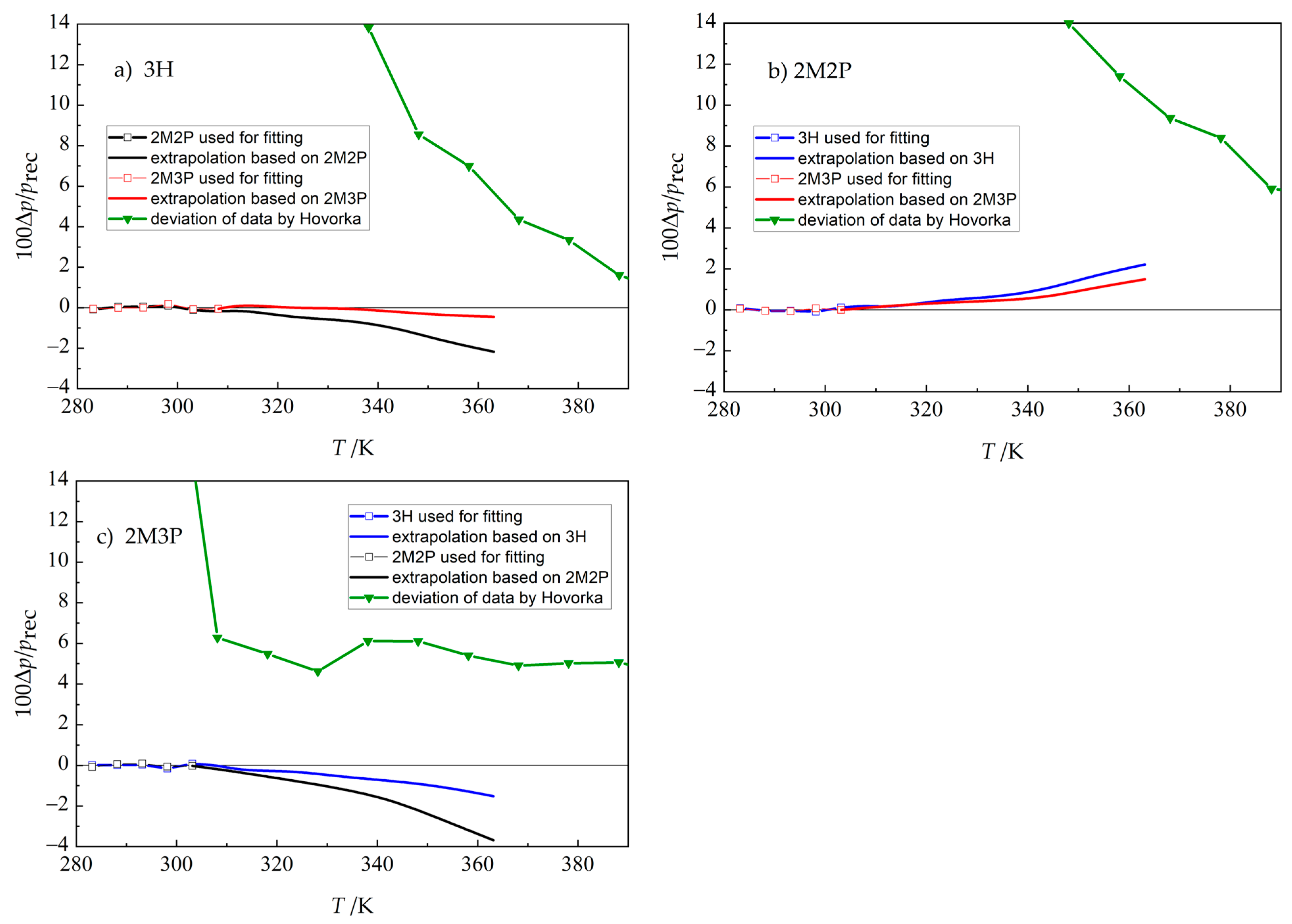 Loginova et al. [40]. Vapor pressures obtained by a combination of static and indirect chromatographic methods (GLC-ACRT (Activity Coefficients–Retention Times) method, Section 3.5 and Section 4.6): − reference 2M2P, − reference 2M3P, − reference 3H.