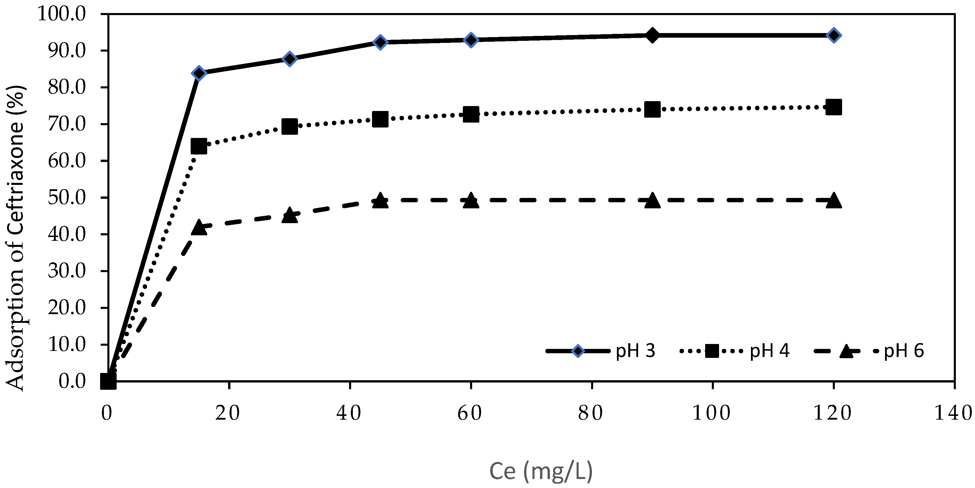 The influence of pH on CEF adsorption was evaluated within the range pH 2–8, adjusted with dilute HCl or NaOH. Adsorption data at these discrete pH values are presented in