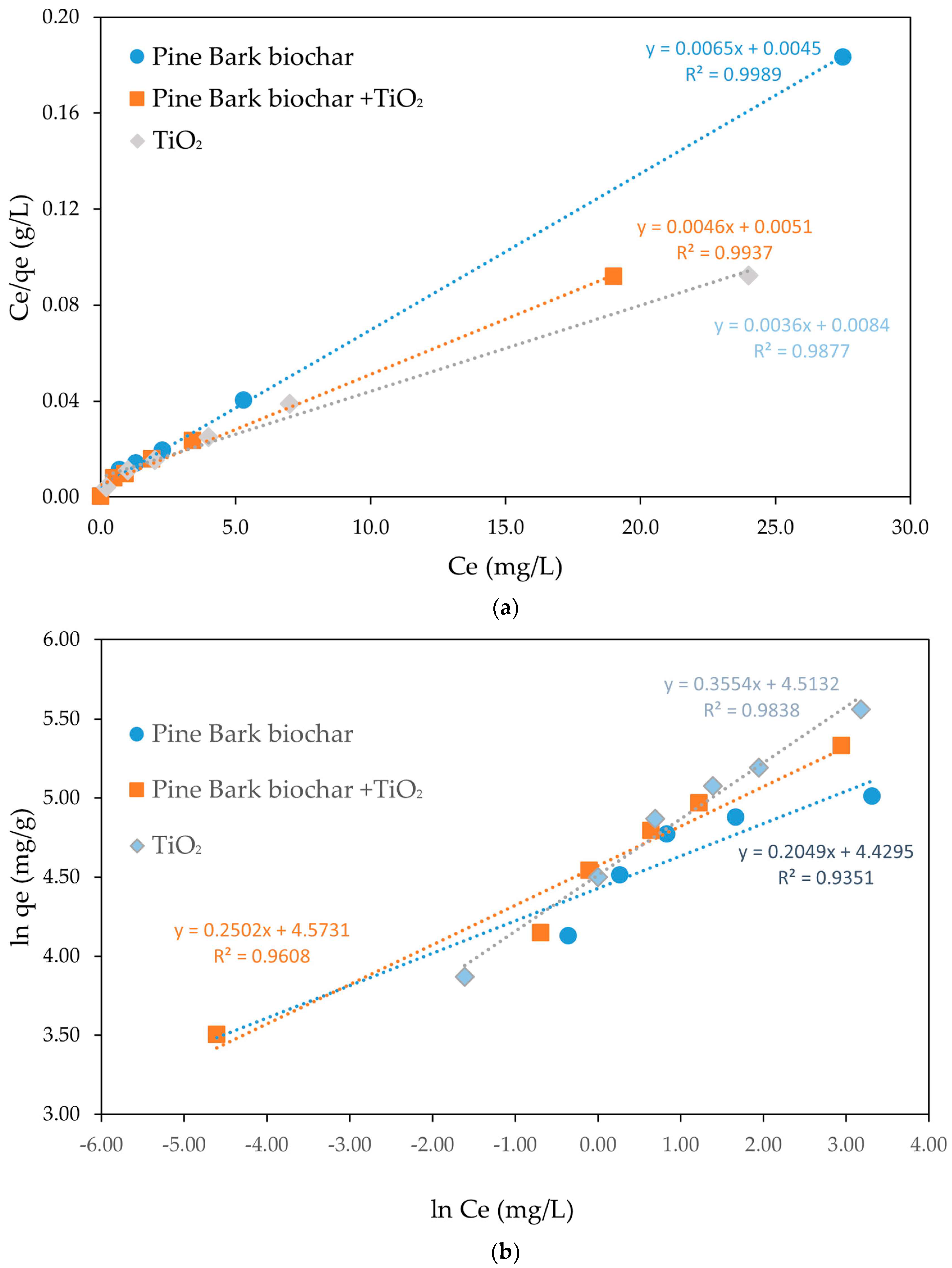 Isotherm modeling showed that CEF adsorption onto pine bark biochar, TiO2, and their combination followed predominantly Langmuir-type behavior, consistent with monolayer adsorption on homogeneous surfaces. Among the tested systems, TiO2 achieved the highest maximum adsorption capacity (280 mg/g), while pine bark biochar reached 154 mg/g, a value higher than that of many biochars reported in the literature. Importantly, the synergistic combination of biochar with TiO2 under UV–Vis irradiation significantly improved both adsorption kinetics and overall removal efficiency (>95%), highlighting the complementarity between rapid adsorption and photocatalytic degradation.