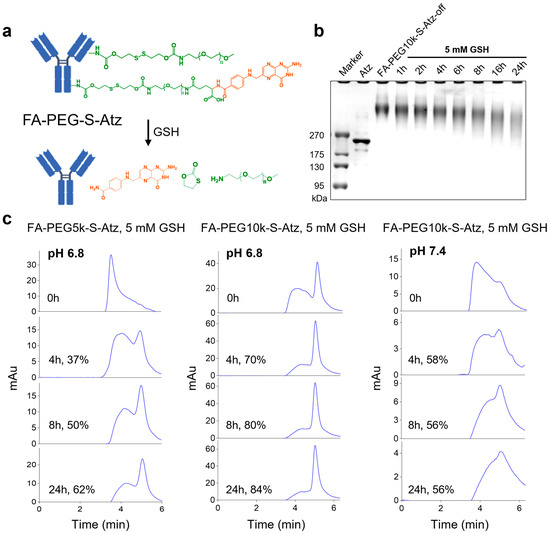 GSH-responsive activation and characterization of FA-PEG-S-Atz. (a) Schematic illustration of GSH-mediated cleavage of PEG shielding chains and folate-targeted group in FA-PEG-S-Atz, restoring the antibody structure. (b) Sodium dodecyl sulfate-polyacrylamide gel electrophoresis (SDS-PAGE) analysis of FA-PEG10k-S-Atz-off incubated with 5 mM GSH over time, demonstrating time-dependent PEG detachment. (c) HPLC analysis of FA-PEG5k-S-Atz and FA-PEG10k-S-Atz incubated with 10 mM GSH at pH 6.8 and pH 7.4, quantifying the impact of PEG chain length and pH on GSH-mediated cleavage efficiency.