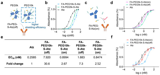Binding activity of FA-PEG-S-Atz regulated by GSH. (a) Schematic showing impaired PD-L1 binding of FA-PEG-S-Atz-off (intact PEG shielding). (b) ELISA binding curves of Atz, FA-PEG5k-S-Atz, and FA-PEG10k-S-Atz to PD-L1. (c) Schematic of restored PD-L1 binding in the “on” state after GSH-mediated PEG cleavage. (d,f) ELISA binding curves of FA-PEG5k-S-Atz (on), FA-PEG5k-S-Atz (off), FA-PEG10k-S-Atz (on), FA-PEG10k-S-Atz (off), and Atz to PD-L1, showing recovered binding after GSH treatment. (e) Summary of EC50 values and fold changes from (b,d,f), quantifying binding affinity restoration.
