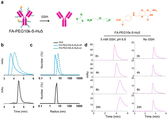GSH-responsive characterization of FA-PEG10k-S-Hu5. (a) Schematic illustration of FA-PEG10k-S-Hu5 with GSH-cleavable targeting group and PEG shielding chain, undergoing disulfide bond cleavage upon GSH exposure. (b) HPLC profiles of Hu5, FA-PEG10k-S-Hu5-off (without GSH), and FA-PEG10k-S-Hu5-on (with 5 mM GSH), confirming conjugation and GSH-induced cleavage (peak shift toward Hu5). (c) Dynamic light scattering (DLS) profiles of Hu5, FA-PEG10k-S-Hu5 (off), and FA-PEG10k-S-Hu5 (on), showing changes in hydrodynamic radius upon GSH treatment. (d) Time-course HPLC analysis of FA-PEG10k-S-Hu5 incubated with 5 mM GSH at pH 6.8 (left panel) and without GSH (right panel) over 0, 4, 8, and 24 h, verifying time-dependent GSH-responsive cleavage and stability in the absence of no GSH.