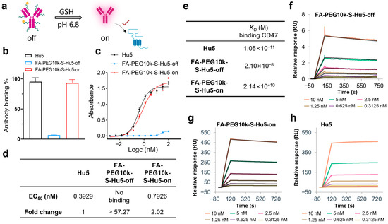 In non-tumor environments, FA-PEG10k-S-Hu5 exists at off state. However, under pH 6.5 conditions mimicking the tumor microenvironment, it switches to the on state upon exposure to GSH and restores its binding ability (Figure 5a). ELISA results showed that at a concentration of 33.33 nM, FA-PEG10k-S-Hu5-off exhibited minimal binding ability to CD47, while FA-PEG10k-S-Hu5-on (after GSH treatment) bound to CD47 at a level comparable to that of Hu5 (Figure 5b). Dose-dependent ELISA curves and quantitative analysis further confirmed this observation: FA-PEG10k-S-Hu5-off showed almost undetectable CD47 binding activity, with an EC50 value more than 57.27-fold higher than that of Hu5. In contrast, FA-PEG10k-S-Hu5 in the on state recovered its binding ability, and its EC50 value (0.7928 nM) was only approximately 2.02-fold higher than that of Hu5 (0.3929 nM) (Figure 5c,d). To further clarify the changes in antibody affinity before and after GSH regulation, we performed surface plasmon resonance (SPR) assays (Figure 5e). The affinity of FA-PEG10k-S-Hu5 in the off state for CD47 was significantly reduced due to PEG shielding (KD = 2.10 × 10−8 M) (Figure 5f). After cleavage with 5 mM GSH, the affinity of FA-PEG10k-S-Hu5 in the on state for CD47 was restored to a level close to that of Hu5 (KD = 2.14 × 10−10 M) (Figure 5g). Notably, Hu5 itself exhibited extremely high affinity for CD47 (KD = 1.05 × 10−11 M) (Figure 5h).