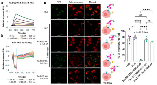 To verify the folate-mediated targeted cellular binding property of FA-PEG10k-S-Hu5, we first evaluated its binding ability to FRα. Results showed that FA-PEG10k-S-Hu5 in the off state acquired FRα-binding capacity, which was directly mediated by folate (KD = 4.02 × 10−9 M) (Figure 6a). In sharp contrast, Hu5 exhibited no binding activity to FRα at all (Figure 6b). These findings clearly confirm that the FRα-binding ability of FA-PEG10k-S-Hu5 is entirely dependent on folate modification, laying the foundation for its folate-mediated targeted binding to tumor cells.