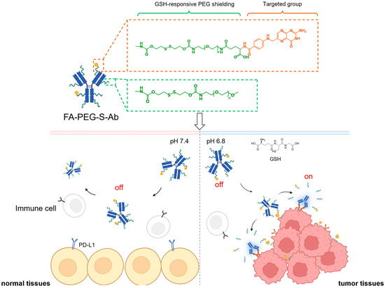 To further enhance the tumor specificity of immune checkpoint inhibitors (ICIs) and address off-target toxicity, we designed an antibody prodrug strategy based on folate targeting and GSH-responsive PEG shielding, termed FA-PEG-S-Ab. The core design of this strategy leverages two key attributes: the high expression of FRα on tumor cells, and the unique biochemical properties of the tumor microenvironment (TME). Compared with normal tissues, the TME has a significantly higher GSH concentration and an acidic pH, whereas the pH is neutral in normal tissues [24,25,26]. These features enable FA-PEG-S-Ab to achieve targeted delivery to tumor sites and selective activation [27,28,29,30].