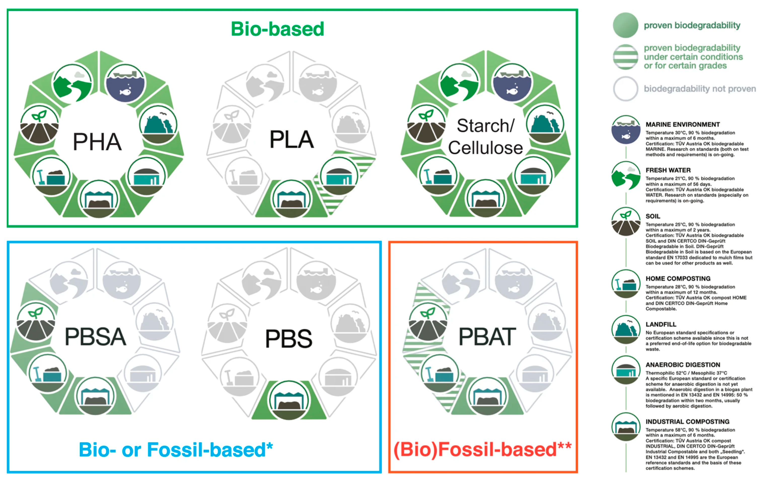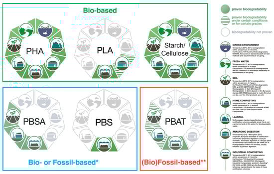 Biodegradability of bio-based and fossil-based biodegradable polymers in various environments. The schematic compares polymers such as PHA, PLA, starch/cellulose, PBSA, PBS, and PBAT, indicating proven biodegradability (green), partial biodegradability (light green), and environments where biodegradation has not been demonstrated (gray). Environments include marine, freshwater, soil, home composting, landfill, anaerobic digestion, and industrial composting. * Polymers can be 100% biobased, 100% fossil-based, or a blend of bio-based and fossil-based; ** Polymer components can be 100% bio-based or 100% fossil-based [45]. Licensed under CC BY 4.0.