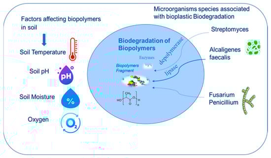 Factors influencing biopolymer biodegradation in soil. Key parameters such as soil temperature, pH, moisture, and oxygen availability affect microbial activity and enzymatic degradation of bioplastics. Enzymes like depolymerase and lipase produced by microorganisms including Streptomyces, Alcaligenes faecalis, Fusarium, and Penicillium contribute to polymer breakdown [90]. Licensed under CC BY 4.0.