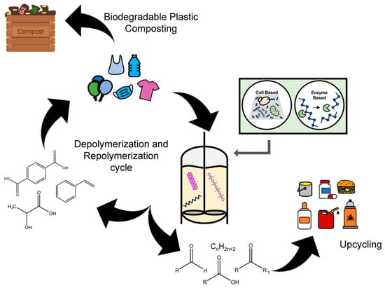 Schematic of plastic biodegradation showing fragmentation into microplastics, enzymatic depolymerization into monomers, and conversion into biomass, CO2, and H2O by microorganisms [90]. Licensed under CC BY 4.0.