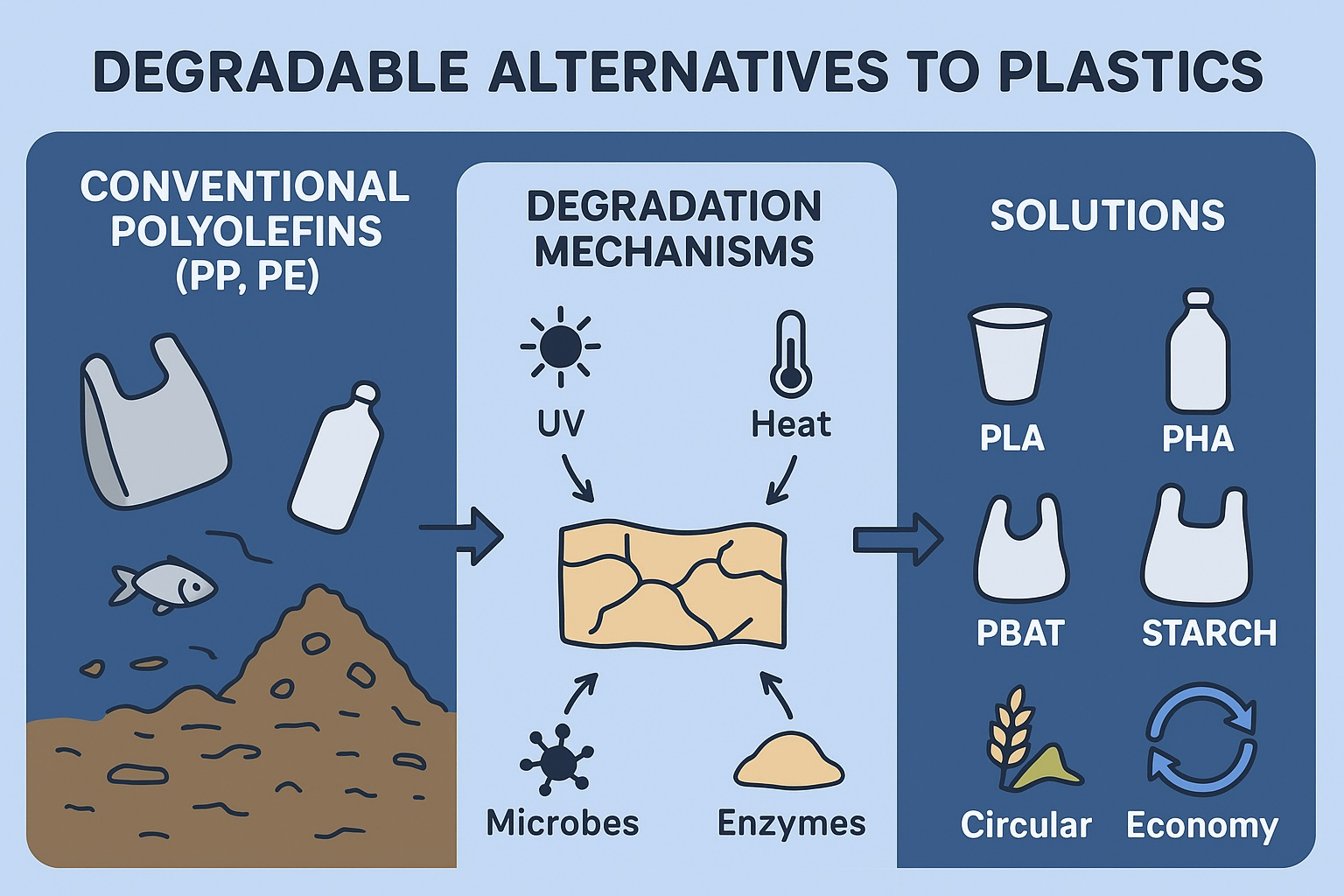 The widespread use of single-use plastics, particularly polyethylene (PE) and polypropylene (PP), has resulted in severe environmental pollution due to their durability and resistance to degradation. This report reviews current degradable alternatives to conventional polyolefins and strategies for enhancing their breakdown in natural and managed environments. Mechanisms of abiotic and biotic degradation are examined alongside the influence of environmental factors and standardized testing protocols. Commercially available biodegradable polymers—such as polylactic acid (PLA), polyhydroxyalkanoates (PHAs), poly(butylene succinate) (PBS), poly(butylene adipate-co-terephthalate) (PBAT), starch-based plastics, cellulose derivatives, chitosan, and protein-based materials—are evaluated for their sources, degradation behavior, applications, scalability, and limitations. In addition, modification techniques for PE and PP, including copolymerization, pro-degradant additives, blending with biodegradable fillers, surface functionalization, enzyme-assisted degradation, and photocatalytic additives, are critically assessed for their potential to reduce environmental persistence. Key challenges such as performance trade-offs, incomplete degradation, ecotoxicity, cost, scalability, and end-of-life management are discussed within the context of circular economic integration. This report concludes with future research directions aimed at developing cost-effective, high-performance materials that degrade completely under real-world conditions while minimizing ecological impacts.