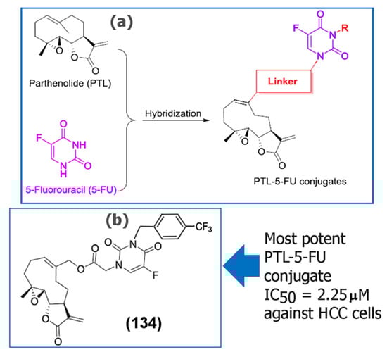(a) Design strategy developed for the synthesis of a 5-fluorouracil conjugate of PTL (20). (b) Chemical structure of the most potent conjugate (134) synthesized. Reproduced with permission from Elsevier, [].