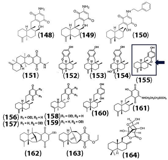 In addition to sesquiterpene lactones, sesquiterpene quinones (SQ) have garnered importance due to their exceptional bioactivity []. Naturally derived sesquiterpene quinones and hydroquinones from marine sources, including 5-epi-smenospongine (148), smenospongine (149), and smenospongiadine (150), have been shown to have potency against multiple cancer cell lines, including U937 monocytic leukemia, HeLa cervical cancer, and HepG2 liver cancer cell lines, with higher cytotoxicity toward the U937 cells []. In addition, one of the isolated compounds, 20-demethoxy-20-methylaminodactyloquinone (151) (Figure 7), also showed a high affinity toward the cyclin-dependent kinase CDK-2 enzyme, which plays a crucial role in the regulation of cell cycles. In a separate study, Jiao and co-workers isolated sesquiterpene dysquinols and quinones from the marine sponge Dysidea avara. The structures of the isolated compounds ((148) through (159)), the anticancer compound avarol (160), and additional sesquiterpene quinones derived from marine sponges (langcoquinone (161), dysidavarone A (162), dysidavarone D (163),herqupenoid A (164)) are also shown in Figure 7 [,,,].