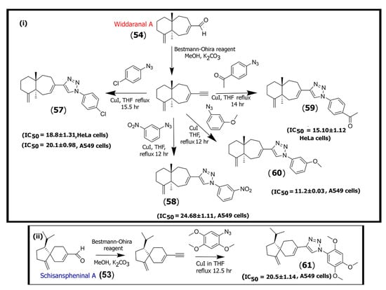 Schematic diagram showing the methodology for synthesizing triazole derivatives of (i) widdaranal A (54) and (ii) schisanspheninal A (53) that showed potency against HeLa and/or A549 tumor cells.