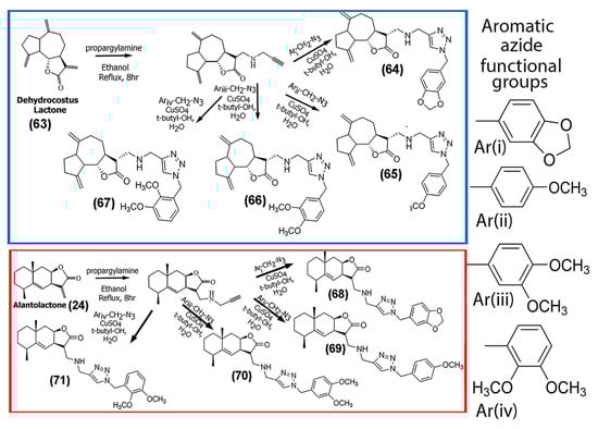 Methodology for the synthesis of triazole-alkoxybenzyl derivatives of dehydrocostus lactone (63) (left), yielding products (72) through (75), and alantolactone (24) (right), yielding products (76) through (79). Adapted from [].