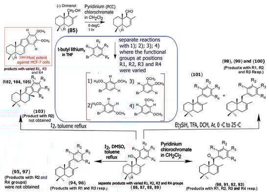 Structures of chemical derivative building blocks strategically developed by functionalizing with a variety of dimethoxyaryl groups using the sesquiterpene alcohol with 7-(-) drimenol (85) as the starting point. The most potent compound against MCF-7 breast cancer cells is shown in the red box. (Adapted from []).