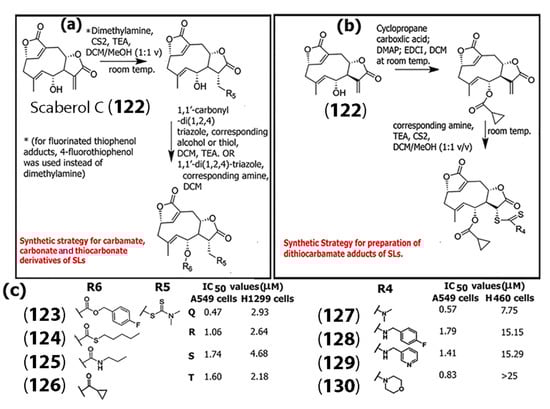 (a) Synthesis of carbamate, carbonate, or thiocarbonate derivatives of sesquiterpene lactones using the SL scaberol C (122) as an example. (b) Synthesis of dithiocarbamate adducts. (c) The chemical structures of substituents R5 and R6 that resulted in the most potent compounds against A549 and H1299 cell lines (left); and chemical structures of substituent R4 that resulted in the most potent compounds against the proliferation of A549 and H460 cell lines (right) (Adapted from []).