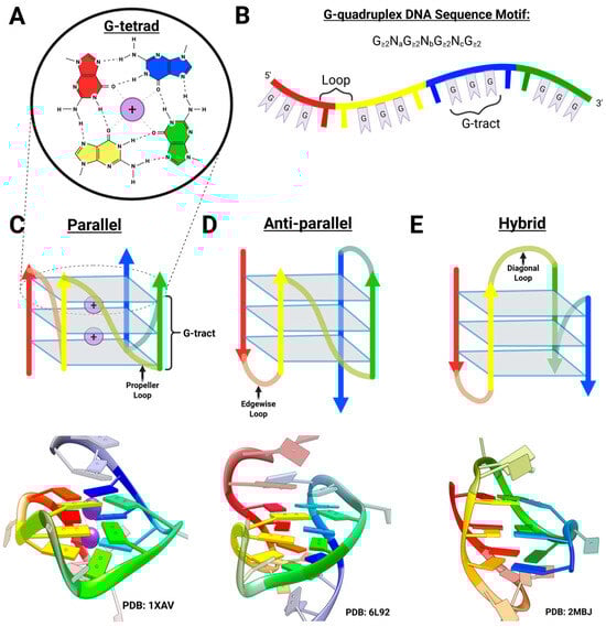G-quadruplex structure. (A) The fundamental structural unit of the G-quadruplex, the G-tetrad. (B) The G-quadruplex sequence motif. with each separate run of Gs color-coded from 5′ (red) to 3′ (blue). (C–E) Cartoon (top) and experimentally determined structures (bottom) of examples of (C) a parallel G-quadruplex, in which all four strands run in the same direction. Dotted circle and lines highlight the G-tetrad portion in the cartoon representations (D) An anti-parallel G-quadruplex, in which there are two pairs of antiparallel stands. (E) A hybrid G-quadruplex, in which one strand runs in the opposite direction of the other three. Figure created using Biorender.