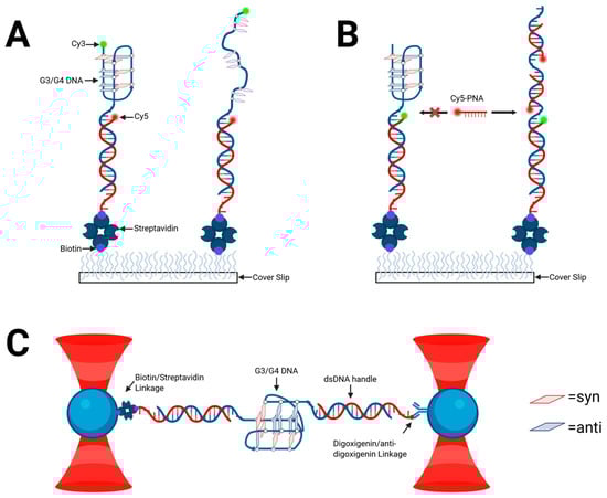 Single-molecule techniques used for the study of telomeric G3 sequences with immobilized DNA strands in red. (A) smFRET. (B) FRET-PAINT. (C) Molecular tweezers. Figure created using Biorender.