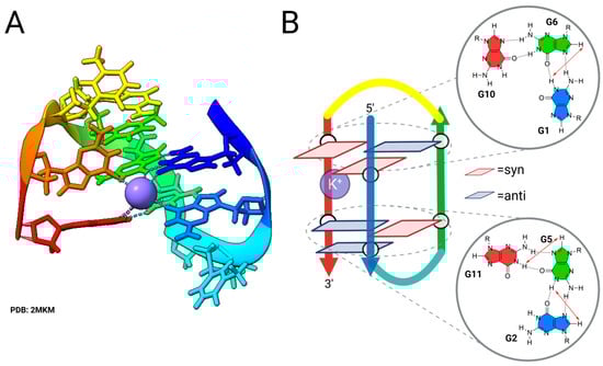 In the case of G4s, cations primarily interact within the central channel formed by G-tetrads in which they coordinate to the O6 carbonyl groups either within the G-tetrad plane or between stacked layers depending on the size and charge of the ion as well as the overall structure of the G4 []. In addition to specific binding to G-tetrads, cations enhance G4 stability via charge screening. In terms of the ions relevant to this review, G-quadruplexes have been found to have a stabilization preference following the order of K+ > Ca2+ > Na+ > Mg2+ [].
