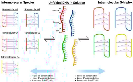 In general, formation of an intramolecular G4 DNA requires a sequence fitting the motif G≥2NaG≥2NbG≥2NcG≥2 (Figure 2B), where four contiguous “tracts” of two or more guanine residues are separated by “loops” of various lengths. This may be further stabilized in the presence of a metal cation, particularly K+, Ca2+, Na+, and Mg2+ []. Formation of multimeric, intermolecularly bonded structures is also possible with guanine-rich oligonucleotides and is favored with sequences containing terminal guanines, as well as solutions containing higher DNA and ion concentrations [].