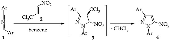 From a methodological standpoint, the most universal and selective protocol for constructing the pyrazole framework is the (3 + 2) cycloaddition (32CA) reaction. Traditionally, this process involves alkynes and diazo compounds, or alternatively nitrilimines [22,23,24], acting as three-atom components (TACs) [25]. This strategy has been widely applied owing to its high efficiency and selectivity, and it remains the cornerstone of pyrazole synthesis [26]. Despite these advantages, the classical 32CA route is not applicable for the preparation of nitro-functionalized pyrazoles, since nitroacetylenes are unstable and cannot be used as practical synthetic reagents [27,28]. To overcome this limitation, alternative methodologies have been proposed. One particularly attractive approach relies on 32CA reactions of conjugated nitroalkenes, followed by the aromatization of the initially formed pyrazoline intermediate [29,30]. In line with this concept, we recently developed a convenient route toward 1,3-diaryl-5-nitropyrazoles (4). In this methodology, the primary cycloadduct (3) formed in the benzene solution was found to be stable only at low temperatures (about 5–10 °C). The lifetime of the molecular individuum is not long, but it was sufficient to perform the analysis. Upon mild heating (about 30–35 °C), however, it spontaneously underwent conversion into the target nitropyrazole (4) via the elimination of a chloroform molecule (Scheme 1) [31]. This mechanistic insight not only broadens the scope of nitropyrazole synthesis but also sheds light on the reactivity of pyrazoline intermediates, paving the way for future exploration of this chemistry.