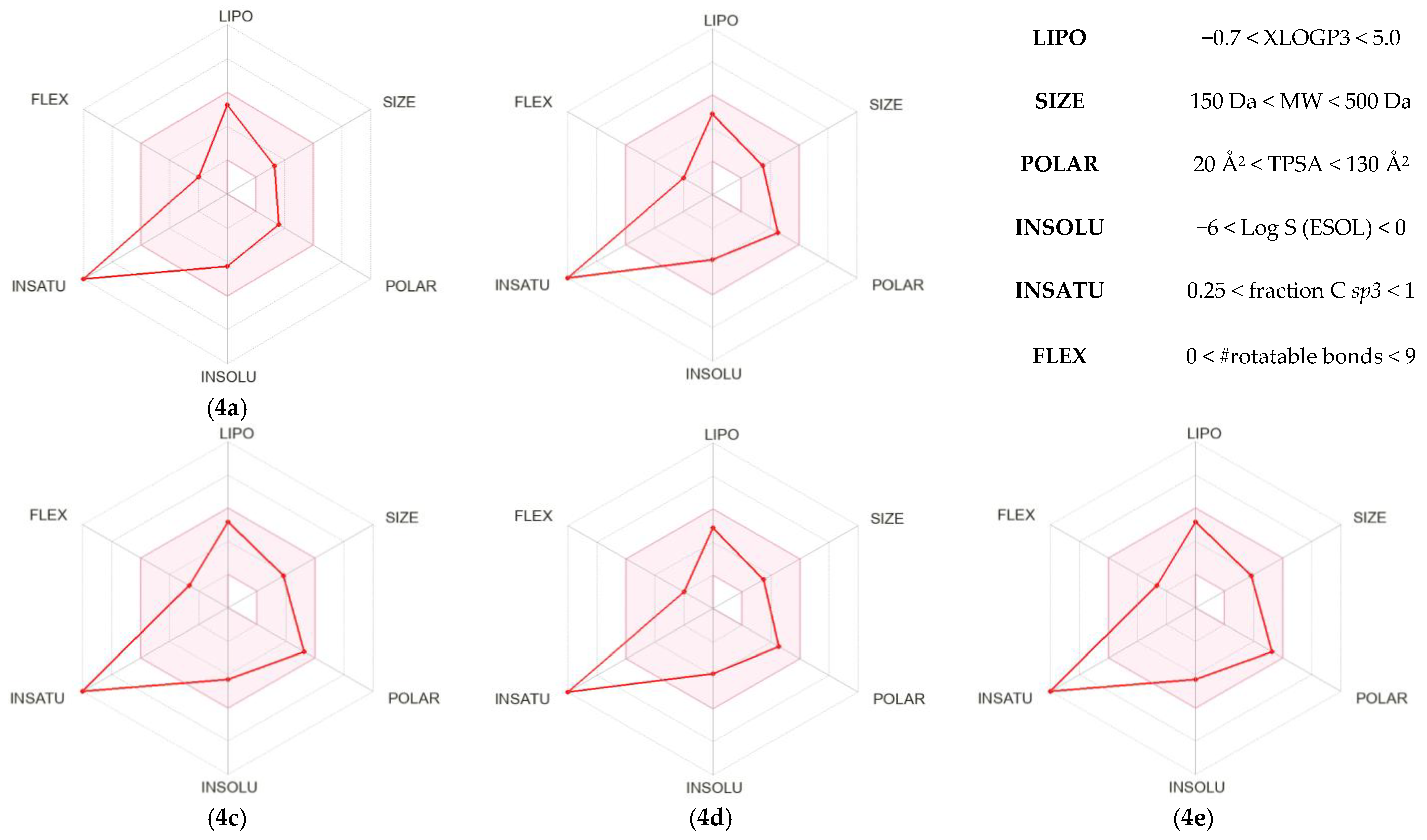 The presented information are fully consistent with the bioavailability radars. They reveal one important aspect that was not considered previously, which is the degree of unsaturation. For all the considered 1,3-diaryl-5-nitropyrazoles (4ae), this value is 100% (Figure 4). This feature is important for the interpretation of future predictive studies of these molecules, but it does not necessarily pose a limitation and can be compatible with favorable pharmacokinetic and biological properties [86].