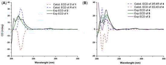Experimental and calculated ECD spectra of compounds 1 and 2 (A) and 3–5 (B).