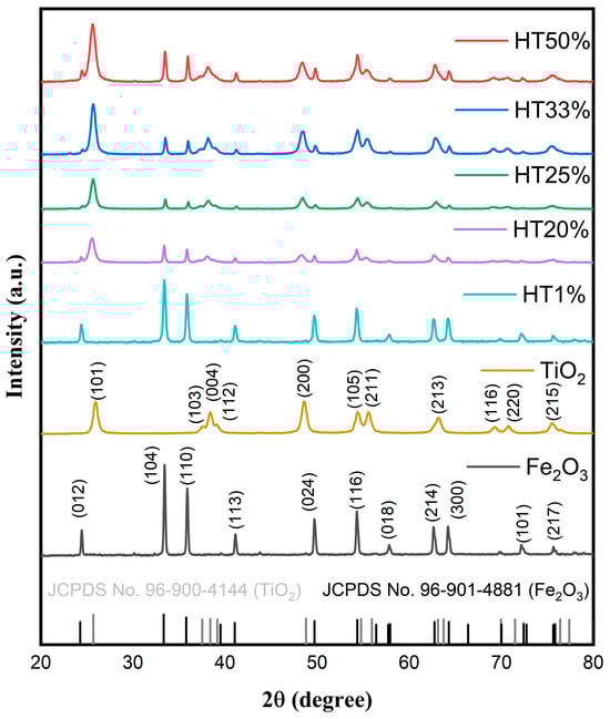 The synthesized composites are hereafter denoted as HT1%, HT20%, HT25%, HT33%, and HT50%, corresponding to hematite–TiO2 molar ratios of 99:1, 80:20, 75:25, 66.6:33.3, and 50:50, respectively.