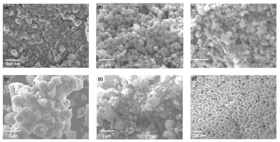 SEM micrographs of (A) H700 (α-Fe2O3), (B) HT1%, (C) HT20%, (D) HT33%, (E) HT50%, and (F) TiO2 samples synthesized using the solvothermal method. The series shows progressive TiO2 coating on hematite as the TiO2 content increases, leading to smoother and more compact aggregates.