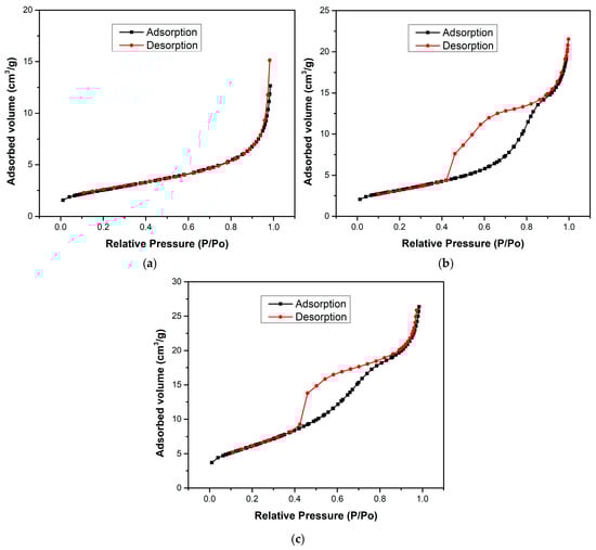 Fourier-transform infrared (FTIR) spectra were recorded on a PerkinElmer Frontier spectrometer (Waltham, MA, USA) in the 4000–400 cm−1 range using an attenuated total reflectance accessory. UV–Vis diffuse reflectance spectra (DRS) of all powdered materials were acquired with a UV–Vis–NIR spectrophotometer (Cary 5000i, Agilent Technologies, Santa Clara, CA, USA) equipped with an integrating sphere, operating in the 300–800 nm range, with BaSO4 as the reference standard. Textural properties of the samples were determined using N2 adsorption–desorption measurements using a Micromeritics, TriStar II Plus analyzer (Norcross, GA, USA).