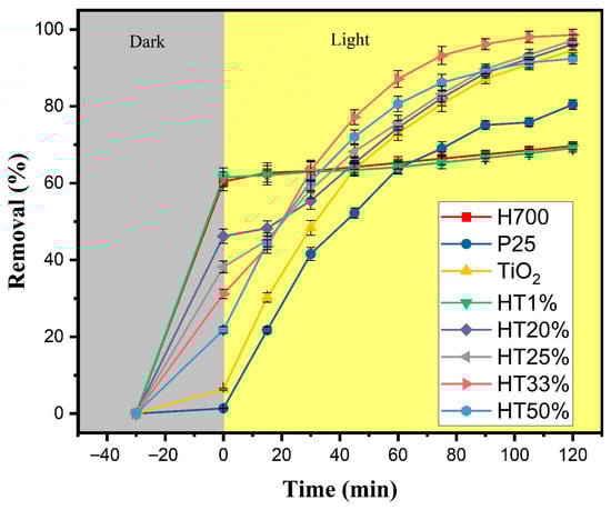 Total removal of methylene blue (10 µM) as a function of time for Fe2O3–TiO2 composites, pure TiO2, P25, and H700. The gray region represents the adsorption phase in darkness (30 min), whereas the yellow region corresponds to the photocatalytic phase under xenon light irradiation (120 min). Error bars represent the standard deviation of two independent experiments performed under identical conditions (n = 2).