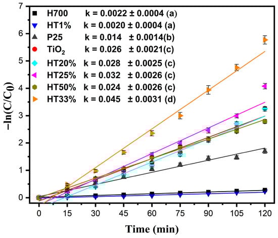 The kinetic behavior of HT1% (k = 0.0020 min−1) was nearly identical to that of pure hematite (H700, k = 0.0022 min−1), confirming that very low TiO2 content does not significantly enhance photocatalytic performance. Additionally, the commercial P25 TiO2 showed a lower reaction rate (k = 0.014 min−1) than the solvothermally synthesized TiO2 used in this study, underscoring the superior structural and functional quality of the prepared material. Statistical analysis using a one-way ANOVA followed by Tukey’s HSD test (α = 0.05) confirmed that the differences among the rate constants were significant, (p < 0.0001). HT33% exhibited the highest k value, whereas H700 and HT1% were statistically similar and the least active (see the legends in Figure 7).