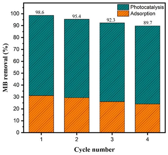 After each cycle, the suspension was centrifuged at 6000 rpm for 10 min to recover the photocatalyst. The solid was washed with deionized water and absolute ethanol and then dried at 60 °C for 12 h before reuse. The subsequent photocatalytic runs were conducted under the same conditions. The photocatalytic performance in each cycle was determined using UV–Vis spectrophotometry at 664 nm, based on the total methylene blue removal after 120 min of illumination.